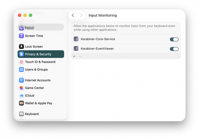 So, that's General → Login Items & Extensions: grant both parts of Karabiner those rights. Additionally: