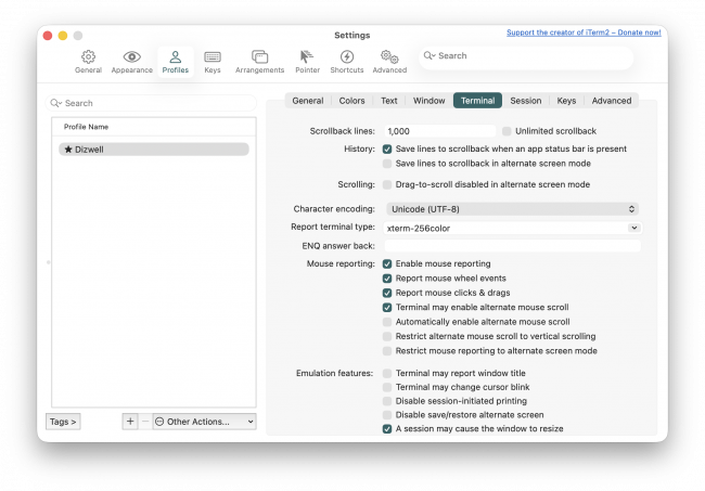 That's me sitting on the Reporting menu of Niente in the bottom part of the screen… but above it is a rendition of the screen when I was sitting on the Integrity Checks menu. Switching between menu items, in other words, creates an 'alternative screen' that is viewable if you scroll upward from the current screen. It is of no use to man or mouse (and WezTerm doesn't suffer from it!). Fortunately, it can be disabled in iTerm2:
