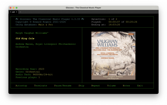 A day later than anticipated, I've just released Giocoso Version 3.32. It contains some significant new features, including support for Kitty graphics for terminals that can't display album artwork using sixel graphics; a terrible logic bomb I created back in 3.30 affecting the way the time bar worked that is now fixed; a new installer that looks better and performs more efficiently; and support (somewhat rudimentary!) for running on macOS.