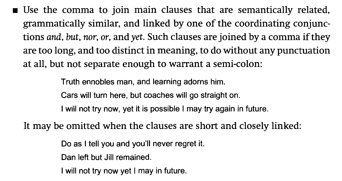 My reaction to that is that it's an awfully convoluted rule to state and difficult to apply: you have to assess whether main clauses are 'semantically related', 'grammatically similar' and 'too long', which is an incredibly subjective thing to determine, I would say. Of the first three examples shown, with commas, I would dispose of the comma in the first two. The third one (“I will not try now, yet it is possible…”) I think is just ugly writing. I would re-write it to be “I will not try now. It is possible I may try again in future”. The second set of three examples are, I think, how I would generally try to write: I wouldn't reserve that comma-less approach for just 'short and closely linked' clauses. Interesting that the last example cited is practically a verbatim re-write of the third but without the comma: I think it proves that the comma in that third example is really unnecessary and thereby demonstrating that comma usage is a matter of taste as much as anything else.