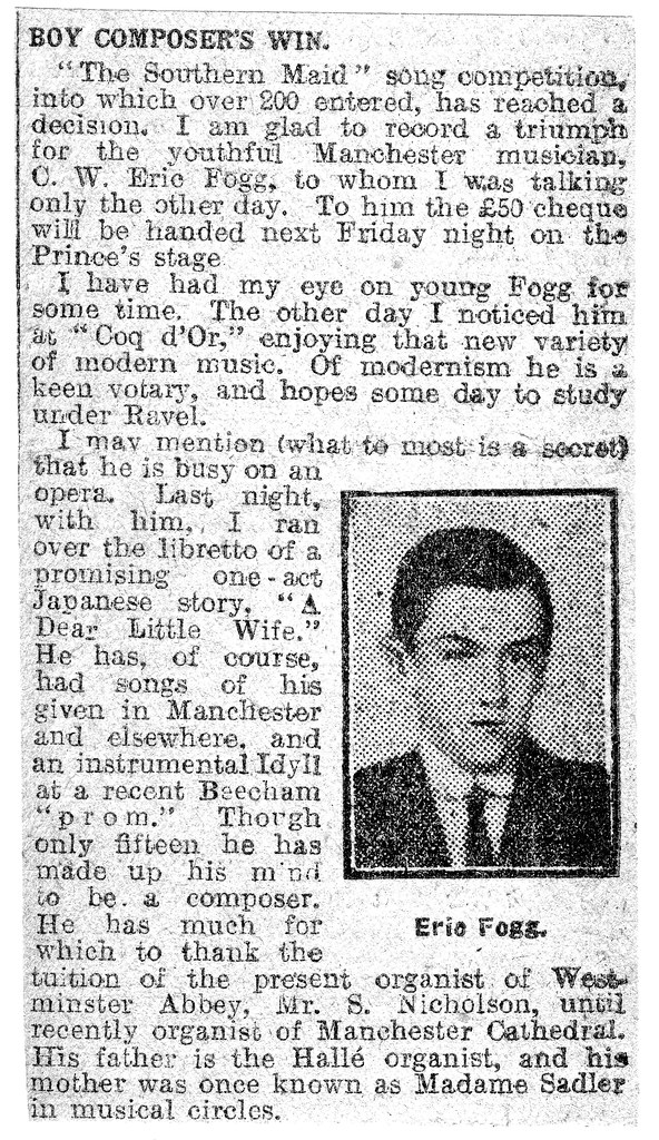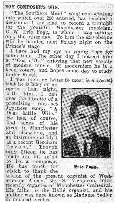 He was actually christened Charles William Eric Fogg, but the 'Charles William' are bracketed by New Groves, indicating that the chap never really used them himself. We can see proof of this in a couple of historical records. First, here's a newspaper clipping announcing his win in a song competition: