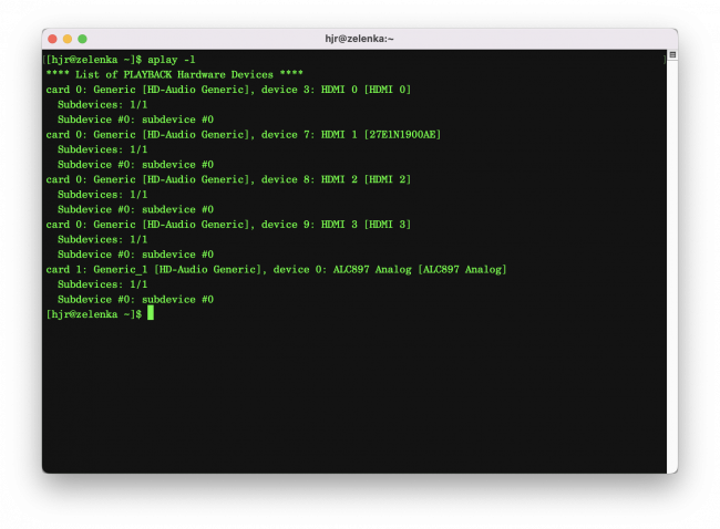Of course, the question then becomes which hdmi port is the right one to use: I think I can rule out the one mentioning '27EIN1900AE' in its details because that sounds like the 27“ monitor and its speakers are dreadful! So, it's one of the other ones… and without much further help, you'll likely have to try each one in turn and check if audio comes through correctly. This is what the 'Test Audio Device configuration' menu option is for: once you've set an audio device to use in the Administration menu, Option 2, this option will play a short piece of music through that device: if you hear it, you know you picked the right device! If not, it's back to Option 2 to specify the next device, then back to Option 6 to see if you chose wisely. And so on.