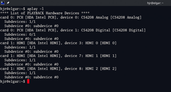The audio device is an important parameter that tells Giocoso where to direct its audio output. By default, the parameter is set to 'default', which on most Linux distros these days will mean Giocoso outputs to a PulseAudio server, though PipeWire is becomeing more common, too (see this blog piece for a bit of an explanation as to how the different Linux audio software layers interact). This may be perfectly acceptable for your purposes. For my own media player, however, I prefer to bypass PulseAudio and instead pass the audio signal direct to the ALSA sound server. To do that, I need to know the hardware device identifier for the Douk ST01 Pro DAC that my music playing PC is connected -and the easiest way of identifying that is to issue the command aplay -l (that's a 'minus ell' at the end there):