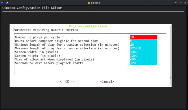 | Size of Album Art | How many pixels wide and high should album art imagery be displayed at? | Defaults to 340. The parameter only takes one value, and then duplicates it for the other dimension. In other words, a value of 340 is converted into an image size of 340×340 pixels: Giocoso always expects to work with square album art imagery! You may need to play around with this parameter as you start working with Giocoso: the album art is usually displayed on the right-side of the main program window when something is playing and it may or may not fit that display area, depending on your terminal, its choice of font and font size and so on. The default of 340 has been set so that if you use the Xterm terminal and the fonts installed by Giocoso for the purpose, in-terminal album art should appear correctly. A 50-pixel high 'caption bar' is automatically added to the bottom of the actual album art: it displays text indicating the composer name and the composition/recording name being played. By default, therefore, you'd end up with a 340×390 piece of album art (that is, 340 pixels wide and 390 high). |