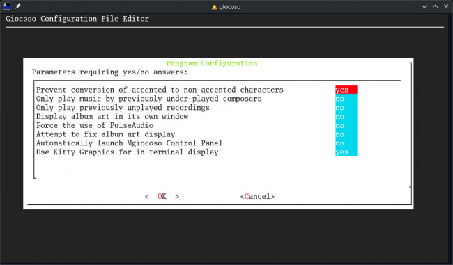 | Display Album Art in own window | Should album art be displayed in its own, separate and movable window? | Defaults to 'no'. Album art is then displayed 'in-terminal' -that is, within the main Giocoso program area. Setting it to 'yes' means album art gets displayed in its own program window, independent of and external to the Giocoso program window. Some operating systems do not know how to display graphics in-terminal very well (or at all!), in which case displaying it in an external window is a good workaround. |