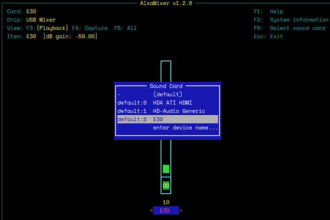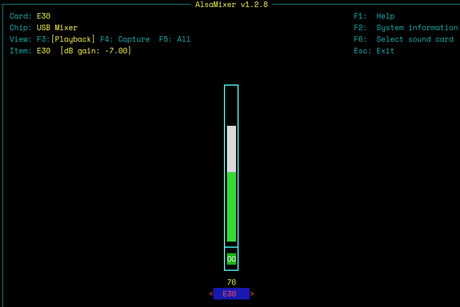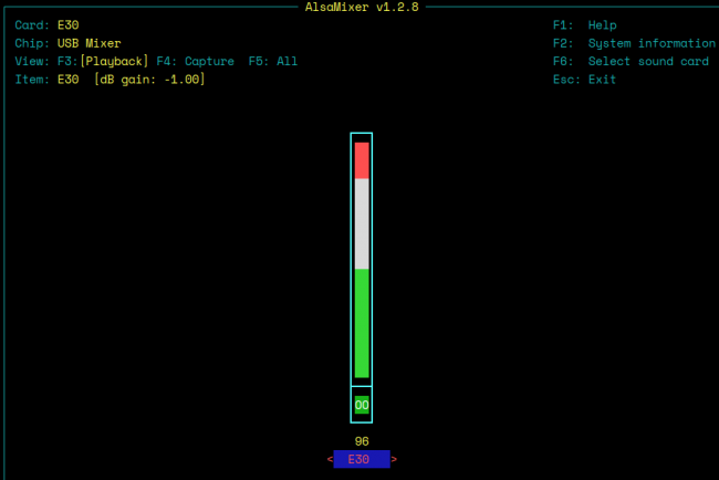 That tells you that alsamixer has opened with the E30 'item' set as the active device. I happen to know that's correct: I play my music via a Topping E30 Digital-to-Analogue converter. So, I can increase that device's volume with the up-arrow: