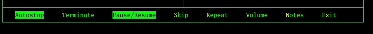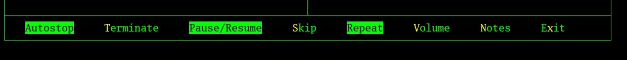 • Notes: This option invokes a text editor and pre-populates it with details of the recording that's playing. The idea is that you can then just type freely anything you like by way of observations about the composition generally or that recording specifically. The text editor that launches when you take this control option will be that which is specified by your system's EDITOR environment; if that's not set at all, then nano is the default editor of last resort. Again, you'll need to know how to use your default text editor (and, specifically, how to save your edits with it), but that is another subject beyond the scope of this particular documentation.