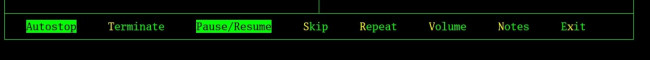 The control options shown in this 'bottom menu' are hopefully self-explanatory. Each is invoked by tapping the letter associated in yellow with each option. That is, type 'A' for 'Autostop', 'S' for 'Skip' and so on. Take note that it's 'x' for Exit, not E, though! Also be aware that the case of the letters you type is irrelevant: type A or a, and Autostop will be engaged regardless, for example.