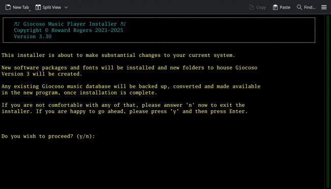If having any of those installed on your system gives you cause for concern, type 'n' when the installer prompts you and give up on the idea of installing Giocoso altogether: the program cannot run without all of them being present, I'm afraid.