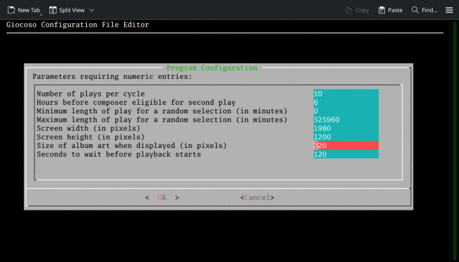 Also note that the Giocoso installer will install the Libre Baskerville font (another open source font, so no licensing issues arise). This is a non-monospaced font (so has nothing to do with the program display in a terminal session), but is instead used to create the 'caption labels' that appear underneath displayed album art. The use of this font is hard-coded and cannot be changed.