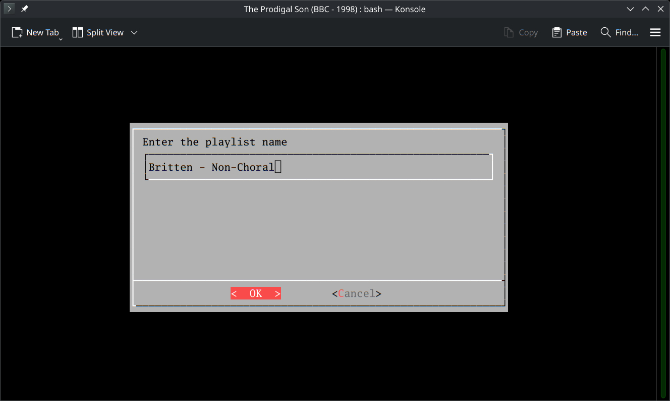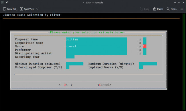 You can fill in as many filters as you like, or none at all (if you fill none in and just press [Enter] to submit a blank form, you are effectively doing a 'play music with defaults', equivalent to taking option 1). If the combination of filters make no logical sense, no music will be selected for playback (for example: you say 'Composer Name=Mozart' and then say 'Composition Name=Fidelio'… since that opera was written by Beethoven, there won't be any recordings that match both selection filters). Filters are always case insensitive: it makes no difference whether you search for “liszt” or “LISZT” or even “LiSzT”. If the recording has been tagged as being by “Liszt”, all three capitalisations will find it. Filters are also always wild-carded, by which I mean that a search for 'brit' will match “Britten”, and one for “amad” will match “Wolfgang Amadeus Mozart”.