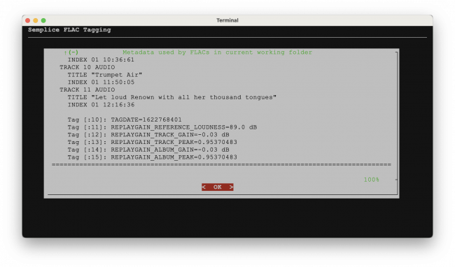 It then loops through each line of that text file. It cd's to each folder in turn. It checks to see if ReplayGain has been previously computed or not: if it has, it simply skips doing anything further and merely increments a 'skipped' counter. If it hasn't, though, it analyses all the FLACs in that folder and writes the newly-computed REPLAYGAIN_* tags back to the FLACs and increments a 'Gain Applied' counter. It also writes the name of the FLACs for which it has modified the metadata into an 'adjusted.txt' on your Desktop.