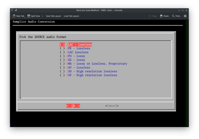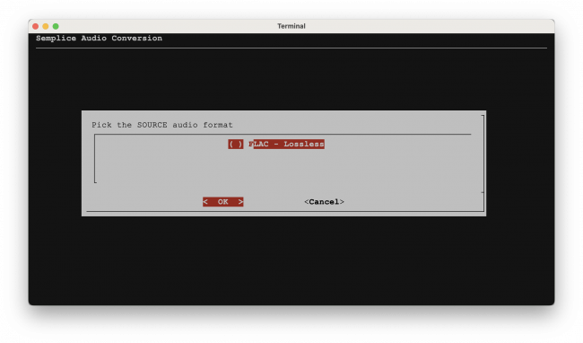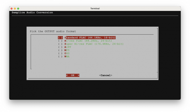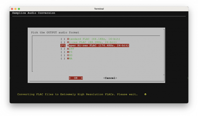 Semplice's Audio Processing menu, Option 2 allows you to convert from ten input formats to seven possible output formats, four of which are lossless and three of which are lossy. A common use for this functionality is to non-destructively convert a bunch of FLACs into a much smaller bunch of MP3s for use on an SD card to be played in the car on a long journey, for example. Another use I have for this capability is to convert the ISOs that are produced by ripping an SACD into a bunch of FLACs that I can actually listen to with the Giocoso music player.