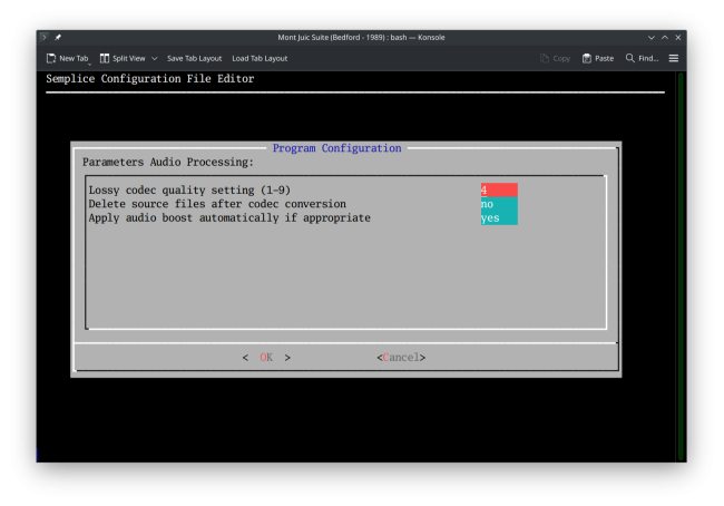 All lossy codecs can be configured to be aggressive or conservative about their lossiness. That is, you can generally switch on something that makes them favour smaller file sizes over audio quality, or vice versa. Semplice is configured by default to output at “average” audio quality, regardless of which lossy output codec is selected, that is about the middle ground in the fight between file size and audio fidelity: this is controlled by the configuration parameter (see the Miscellaneous menu, Option 1) Lossy codec quality setting (1-9):
