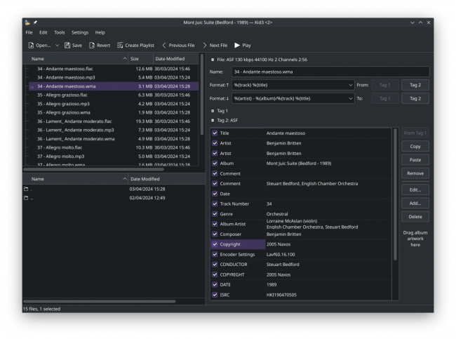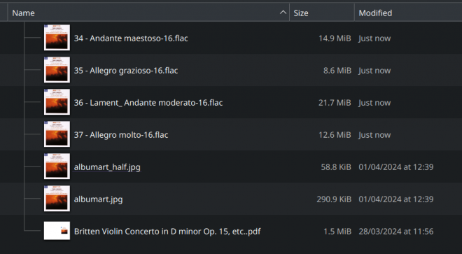 You'll notice that there are four FLACs here, along with four 'just now' created MP3s: the source and output files co-exist on disk without drama, and the conversion process has been entirely non-destructive to the originals. You'll notice too, I hope, that the MP3s seem to have embedded album art. If you were to inspect one of them with a tool such as kid3, for example, you'd actually see it's even better than that: