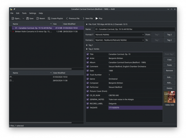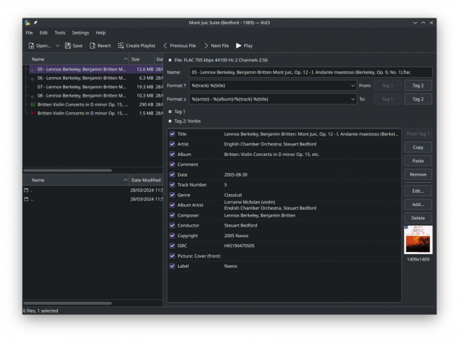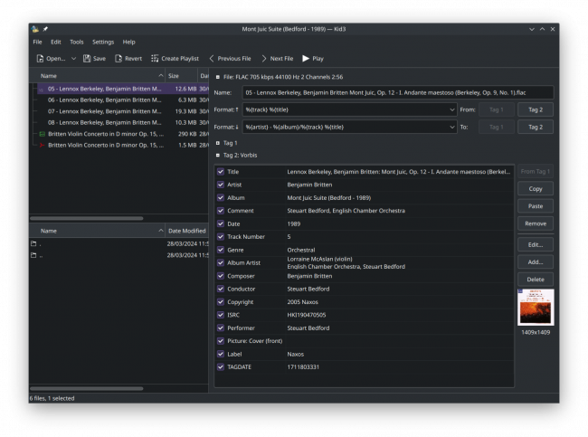Now, you can see that ARTIST is 'Benjamin Britten'; DATE is '1989', GENRE is 'Orchestral' and COMMENT is the 'Steuart Bedford, English Chamber Orchestra' entry I made on the second of the recording-wide tag entry screens above. We see evidence, therefore, that the new metadata has been written to these FLACs -though you might note, in the top left-hand corner, that the file names have not been touched and, specifically, the files start with numbers 5, 6, 7 and so on. You can also see that TRACK NUMBER is set to 5 for the first of these files: supplying recording-wide tag data does not change anything about the FLACs or their metadata beyond what you were prompted to supply, in other words.