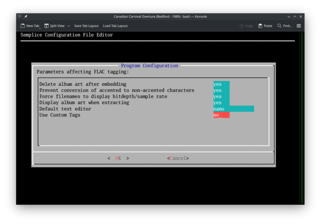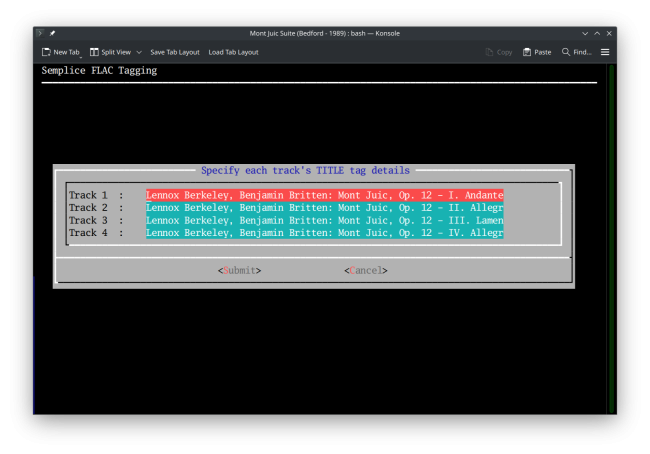 If you click Cancel, your data entry up to that point is lost and nothing is written to the FLAC files: you are returned to Semplice's Tagging menu without any file alterations having been made at all. If you click the Submit option, however, then your data is saved to memory -but not yet written to the FLACs themselves (so, if you accidentally press [Submit], you can then press Ctrl+C to terminate Semplice entirely, and your FLACs will still not have been altered).
