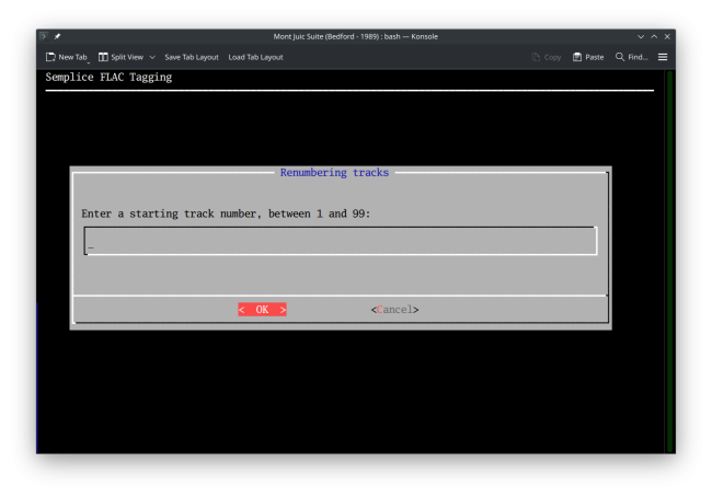 You are asked to type in a starting number: Semplice will increment it as many times as needed to get to the end of the FLACs in the working folder, and in each case (a) write the new number into the TRACK NUMBER tag; and (b) rename the physical file so that its name also reflects its new track number. If you leave the field blank and just click [OK] (or press [Enter]) without having entered a number where prompted, the number '1' is assumed. But you can explicitly type '1', as well. Or you can type any other number you like. Here's the situation before I press [OK] here: