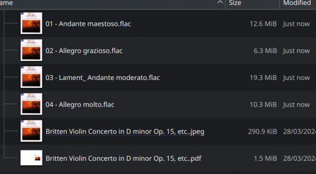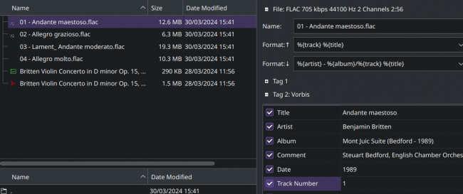 There are a couple of things to note here. Firstly, the TITLE tag is now a lot shorter than it was originally. Clearly, the 'minimal musical facts' that I entered on the per-track tagging form has now indeed been applied to the physical FLAC files. Secondly, however, look in the top left-hand corner of the screenshots: whereas before I was dealing with files called things like '05 - Lennox Berkeley, Benjamin Britten M…', I'm now working with files called '01 - Andante maestoso-16-44100.flac'. Writing TITLE tags triggers Semplice, in other words, to apply the TITLE to the physical file name itself …and to start numbering the files in the folder from zero-padded 1 (that is, the first file here used to be called 05… but is now 01…).