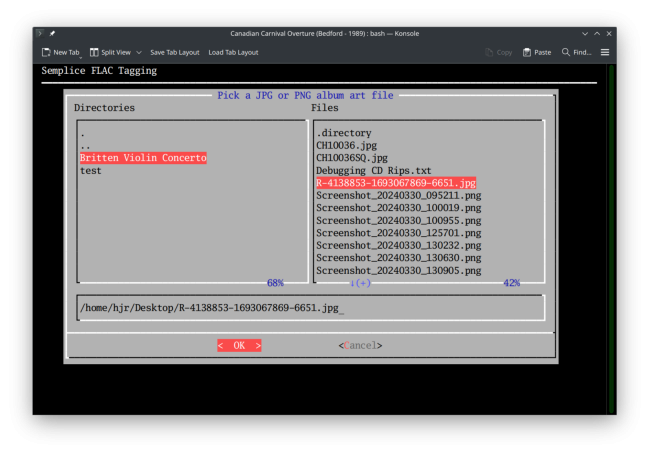 Make sure you actually press [Spacebar] when the JPG or PNG is highlighted in the right-hand panel: you want the horizontal panel's text to specify the complete path and filename of the image you're selecting. Here, you see 'R-413…jpg' does appear, spelled out, in the horizontal panel, so I'm good to click [OK] (or press [Enter]). If I were to click [Cancel] (or select it with arrow keys and [Tab] presses and then press [Enter]) I would be returned to the Semplice Tagging menu, with nothing having been written to the FLACs in my working folder.