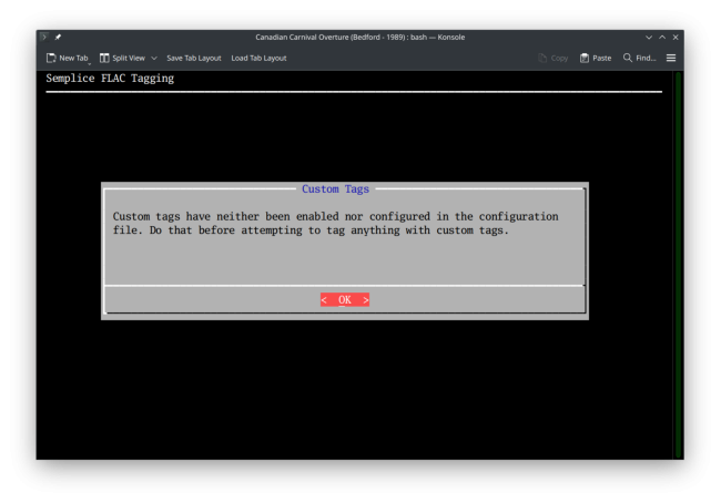 This tells you that (a) you have to enable the use of custom tags in the first place; and (b) you have to configure what custom tags you want to use before you can actually use them. Click [OK] here to return to the main menu.