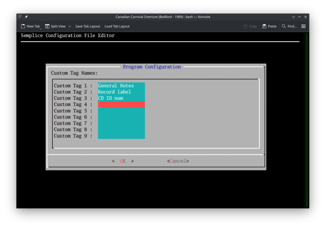 Here's where you see that, though Semplice displays the custom tag prompts with spaces, in reality they are embedded within the FLAC with underscores (look at 'CD ID NUM', for example, and see how it is stored as CD_ID_NUM). Similarly, where I had originally said 'General Notes' in mixed case when editing the configuration file, you can see from above how it has been stored as GENERAL_NOTES, all in upper case.