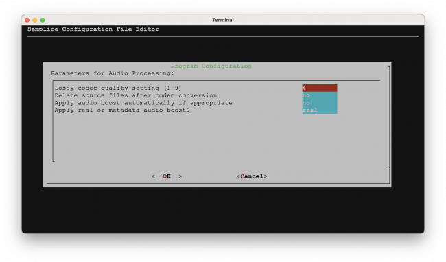 The second parameter to configure is the last one shown on that previous screenshot: Apply real or metadata audio boost. This determines whether Semplice will go through the business of re-encoding your FLACs to produce new ones which physically contain within them the volume-boosted audio signal or, instead, simply compute a ReplayGain for the FLACs and then write them as metadata tags to each FLAC in turn. This parameter therefore defines the type of volume boost you'll get. The default is “real”. If you want ReplayGain tags added to your files instead, you need to type in a value of “metadata” here.