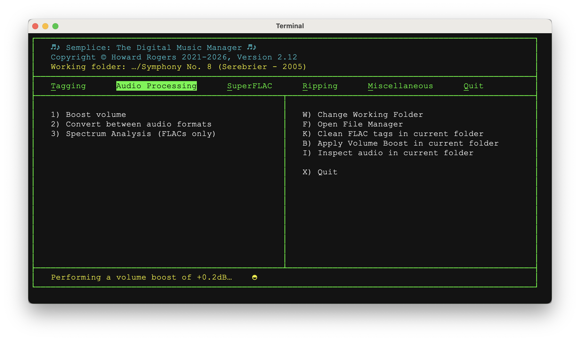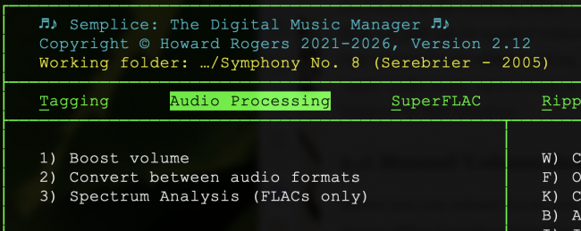 In this case, I'm working in a sub-folder called 'Symphony No. 8 (Serebrier - 2005'. Once a working folder has been selected, press 1 to enter the volume boosting business.