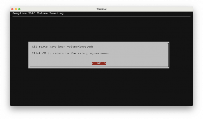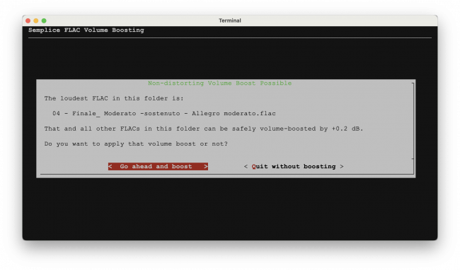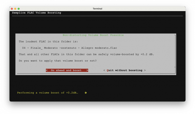 Obviously there are two options at this point: go ahead and apply the proposed boost, or quit without doing so. If you select the 'quit' option, you will return to the Audio Processing menu and your FLACs will not have been altered at all or adjusted in any way.