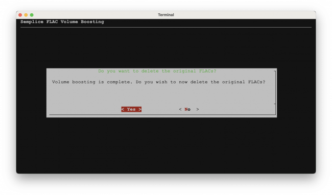 We can therefore conclude that saying 'yes' to the question about deleting the originals not only triggers the deletion of the original FLACs but also causes file names to be adjusted so that the surviving files acquire the names originally owned by the non-volume-boosted originals.