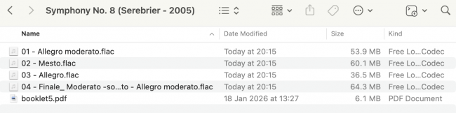 The first thing you'll notice is that only one set of FLACs remain: we had eight of them before but now only four remain. So, something's been deleted. A quick glance at the file names might lead you to think that it's the volume-boosted FLACs that have been deleted, because nothing now remaining is called '+.2-dB…'. Pay closer attention to the file sizes however: File 01 is 55.5MB, file 02 is 61.8MB, and so on. Go back a couple of screenshots and you'll see that those were the sizes of the volume-boosted FLACs, not the originals.