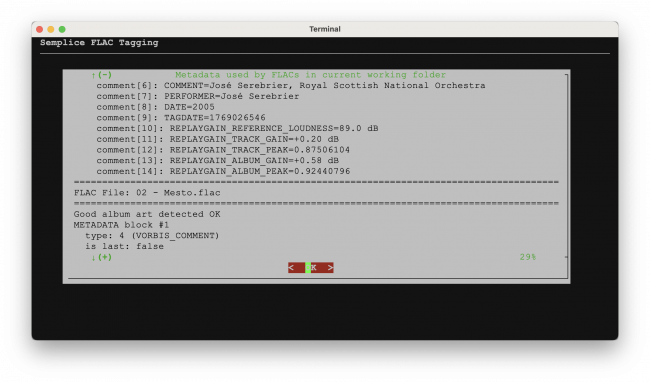 Click [OK] there and you'll be returned to the main program menu: switch over to the Tagging menu, Option 7 to read all the metadata that's still stored inside your FLACs and you should be able to confirm that no REPLAYGAIN_* tags of any kind persist.