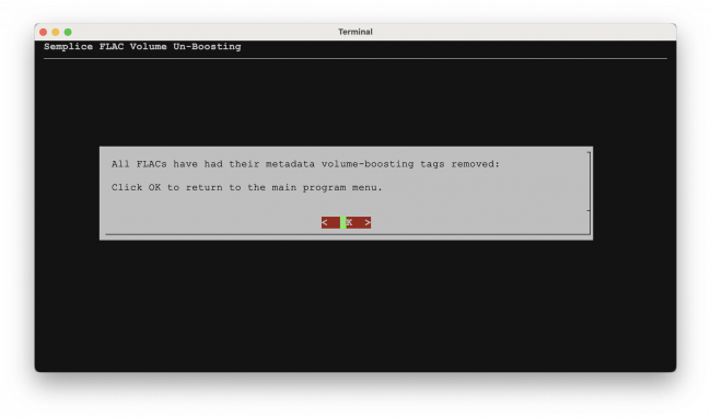 I've mentioned several times that metadata volume boosts are reversible: the question then arises how you reverse one, after it's been applied? The simplest approach is to take Semplice's Audio Processing menu, Option 4: Remove ReplayGain tags from FLACs. The option works immediately, without prompts, to remove all REPLAYGAIN_* tags that might be present in a FLAC or set of FLACs. There are no prompts, of course, because the operation is trivially reversible: just perform a fresh metadata volume boost and fresh tags will be written back to the FLACs once more. Removing the tags takes practically no time, so Semplice puts up a dialog to tell you the operation has actually worked: