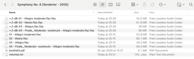 What you see here are the original FLACs named '01 - Allegro moderato', '02 - Mesto' and so on, together with a bunch of files modified more recently (and at the top of my file listing) with names such as '+.2-dB-01 - Allegro moderato' and '+.2-dB-02 - Mesto' and so on. Obviously the volume-boosted files are the ones with the “+.2” in their file names: that's the maximum volume boost that the earlier screen mentioned could be safely applied.